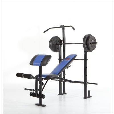 The Marcy MCB252 weight bench and weight set combo from Impex Fitness is perfect for those just starting a weightlifting routine. This multifunctional weight bench that holds standard (5') and mid size (6') barbells comes with a 120lb. vinyl coated weight set. (Set includes: one-piece standard size weight bar, 2 standard spring retaining clips, 2 x 25lb. weight plates, 2 x 15lb. weight plates and 4 x 10lb. weight plates.) The 1.25" x 1.25" heavy duty steel tube frame has a durable powder coat finish designed to withstand years of bench pressing. Weight bench exercises help to strengthen upper and lower body muscle groups, burn calories, lose weight, tone and define muscles, and increase overall strength and stamina. The unique design offers an interchangeable lat tower and preacher curl pad. A storage post on the back of the bench will hold either the lat bar or the curl pad when not in use. The 4-position back pad adjusts to chest press and 2-position incline press positions. The included total leg developer helps to isolate the training of your quadriceps, hamstring's and glute muscles. One weight plate storage post can be found on either side of the bench frame. Back and seat pads are constructed of high density rolled upholstery from top grade high density foam. Maximum 300lb. user weight capacity and maximum 200lb. weight capacity on bar supports. A two-year limited manufacturer's warranty against defects is also included.