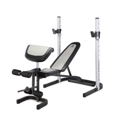 The Gold's Gym® Platinum mid-width bench features flat, incline, decline and military positions that are sure to help you achieve the chiseled physique you're after. It's also designed with adjustable uprights, a squat rack and a rolled preacher curl. An exercise chart is included.